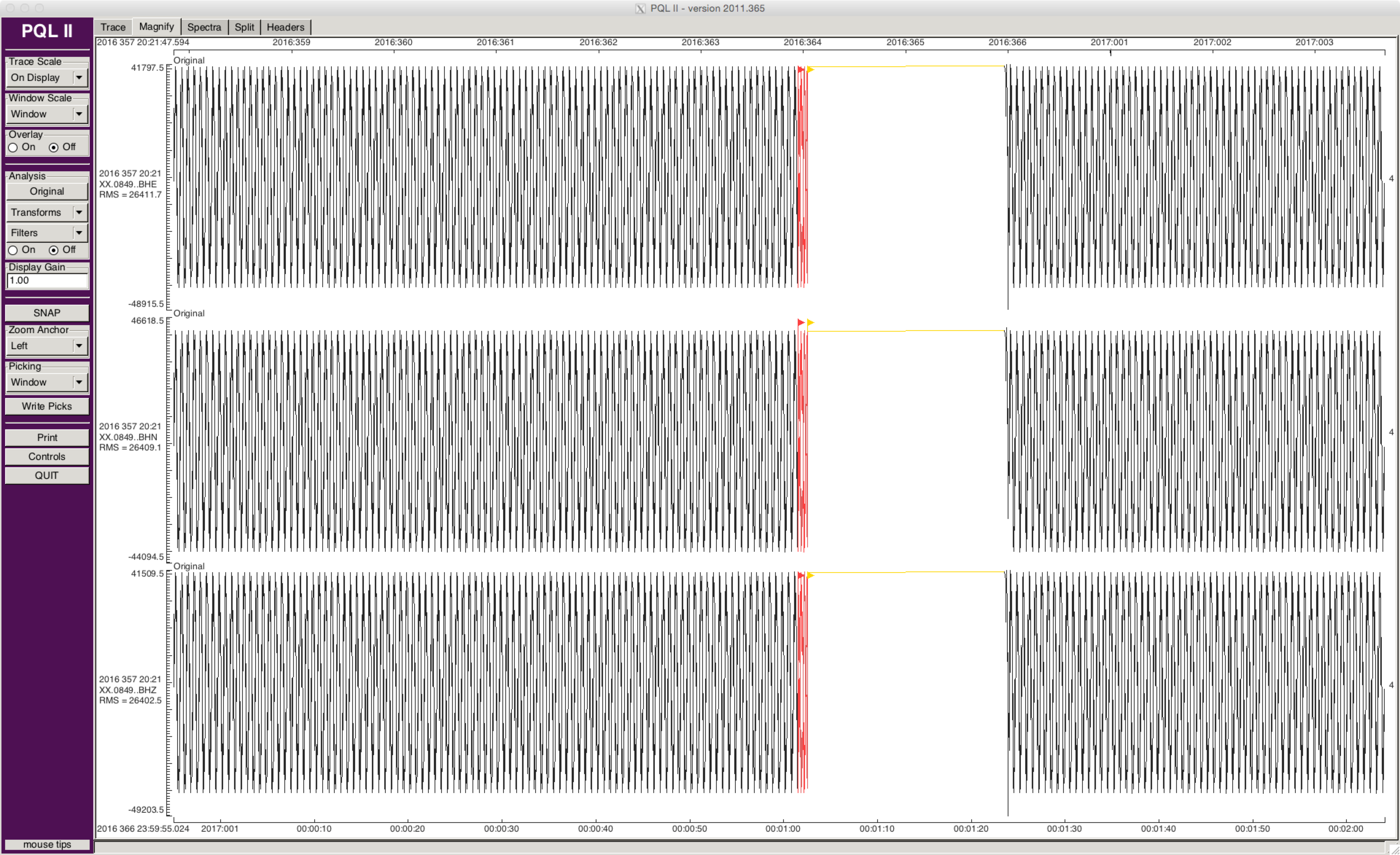 Figure 1: PQL plot of ~2 minutes of sine wave Q330 data channels centered on the year rollover with ~1 second overlap and 21 second gap.