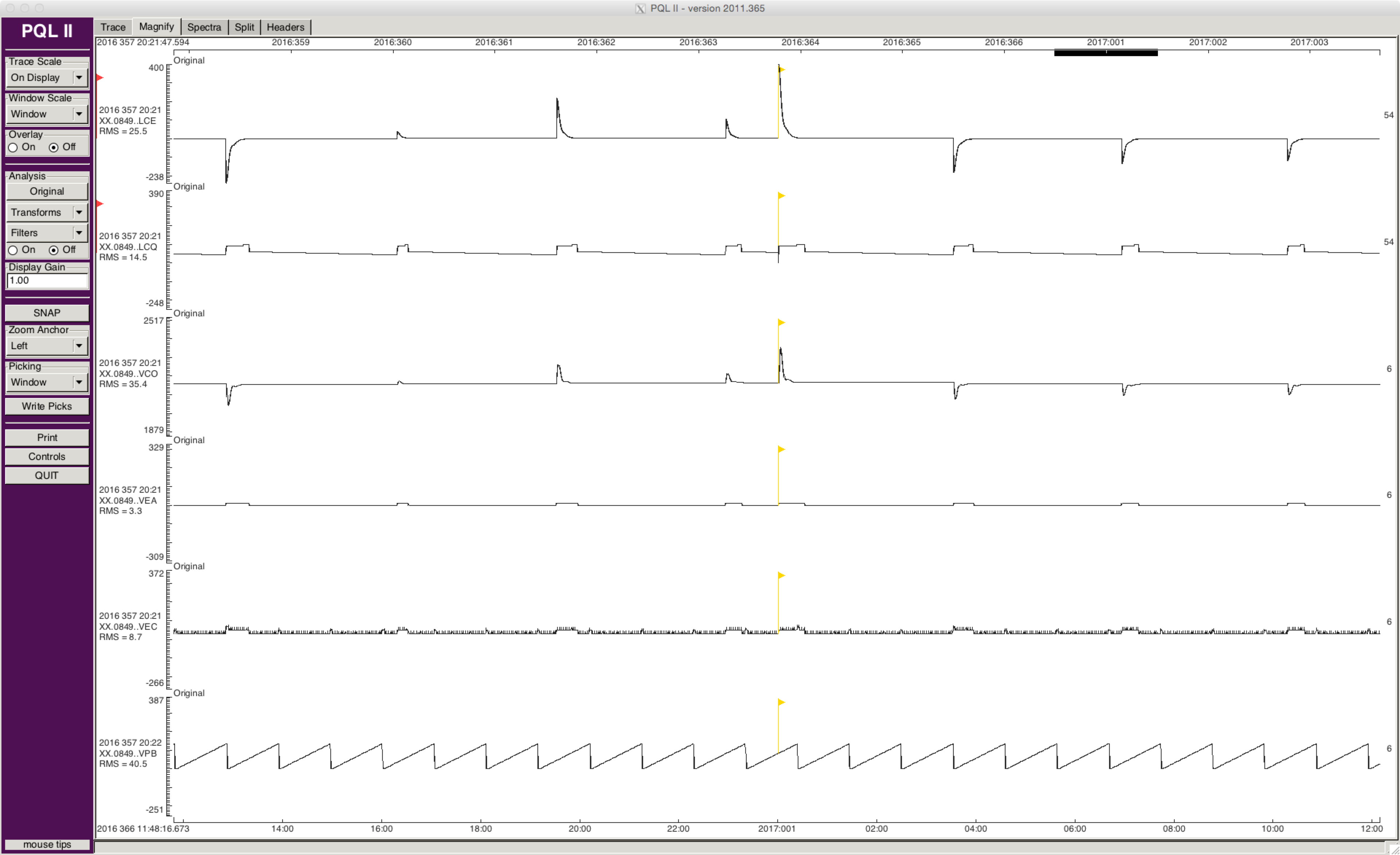 Figure 3: For context, ~24 hour PQL plot of same selected Q330 SOH channels, centered on the year rollover, showing the additional GPS On cycle on the day rollover and the phase correction during that cycle.