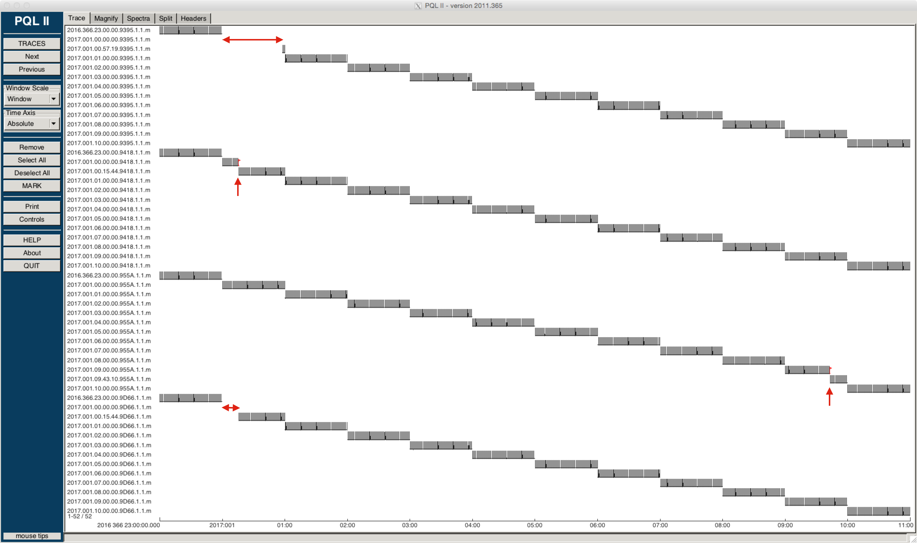 Figure 4: PQL plot of bench data (1 sec pulse once per minute) for channel 1 of four RT130 units from 2016 Dec 31 23:00:00 to 2017 Jan 1 11:00:00. The red arrows indicate when the leap second correction occurred and where there were gaps in the data plotted by PQL (see text).