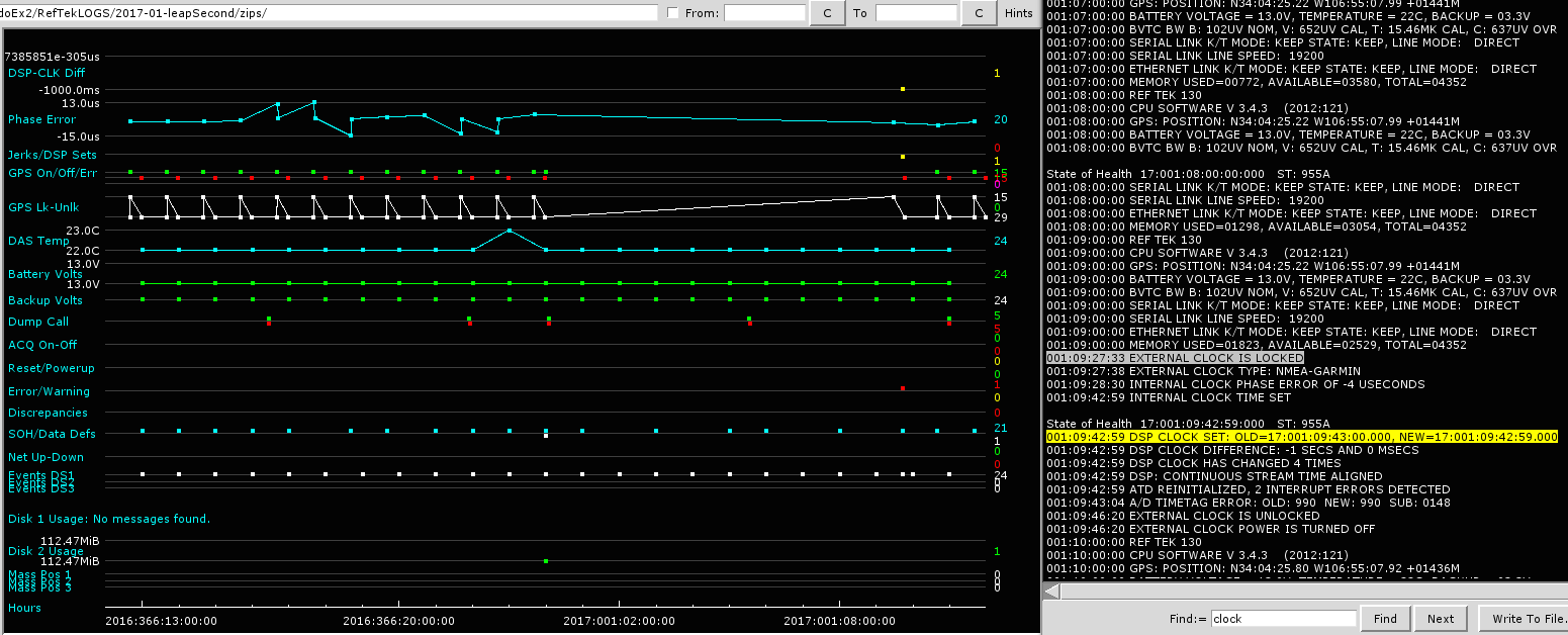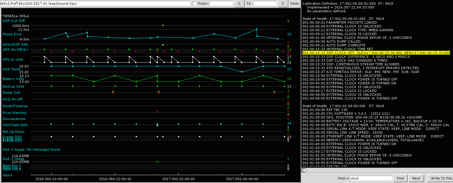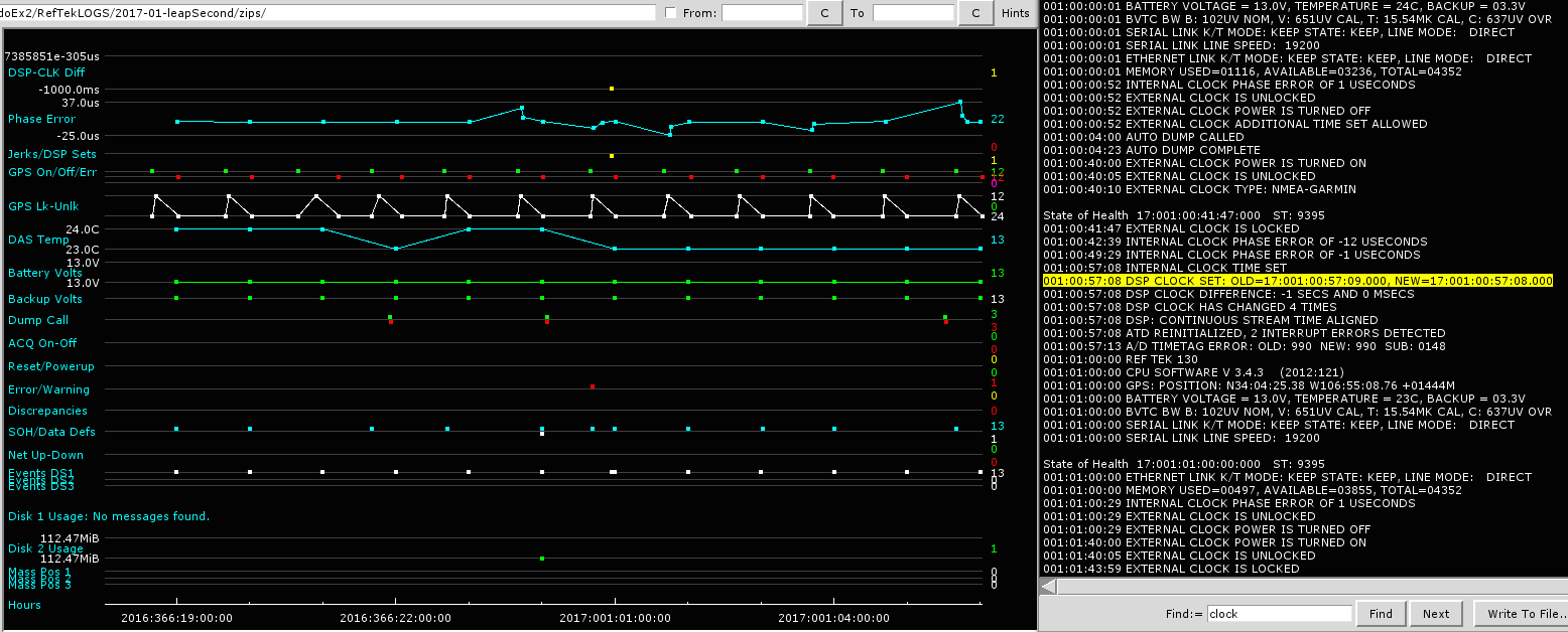 A leap second was added on December 31, 2016 at 23:59:59. This has the effect of delaying the year rollover by one second. Let's say that a datalogger (DAS) is running with its oscillator keeping time, with the GPS off, and then the DAS turns the GPS on when it thinks it is Jan 1 2017 00:00:01. If the GPS could get a lock instantaneously, the time from the satellites would be Jan 1 00:00:00, and the DAS need to do a -1 second time correction. Details of how EPIC Q330 and RT130 dataloggers handled the leap second and what users may expect to see in their data are described below. Also note that the dataloggers on the EPIC benches during the leap second had no problems obtaining GPS locks. If a GPS in the field is having difficulty obtaining a lock on the satellites, the leap second correction could be delayed.