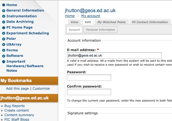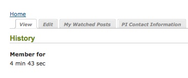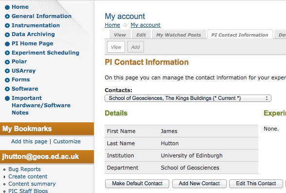 The "My Account" page has tabs for View, Edit, PI Contact Information, and more.