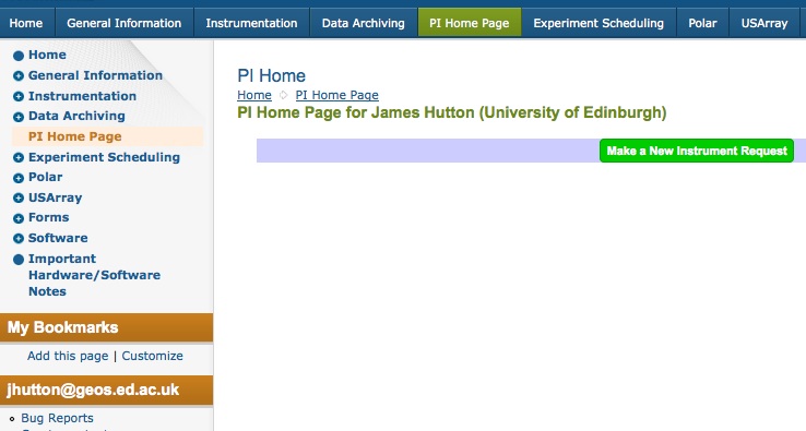 As a PI, upon logging in, you will have your own "PI Home Page", here. There are links to the PI Home Page from the top banner, and also from the left-hand-side Navigation Menu. The PI Home Page lists all of your projects, along with their status, and with controls to view the projects, and (if appropriate) Mobilize the projects, or submit experiment and data evaluations. If you don't have any projects yet, all you will see is the button to Make a New Instrument Request, as shown.