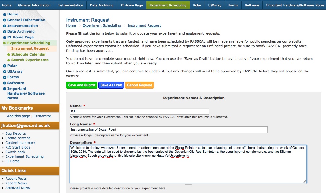 On clicking the "Make a New Instrument Request" button, you will go to the page to add a new Request. You don't have to submit the request until it is ready; you may save your request as a Draft, and come back to it later. Once the request is ready to be submitted to EPIC, you can click the "Save and Submit" button to send it to EPIC for consideration. If there are errors (e.g. end date comes before start date, a required field was omitted, etc.) these will be red-flagged so that you can correct them; once these corrections are made, you will be able to save a draft, or complete the submission process.