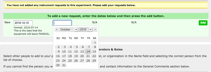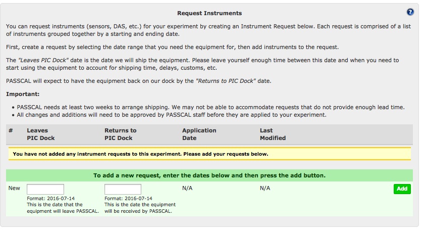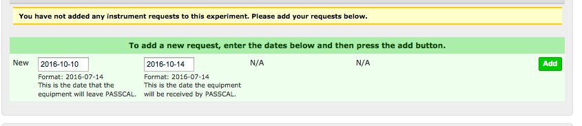 The next part of the request form covers the Instruments which you are requesting. An experiment may have one or more Requests (i.e. multiple phases on different dates), and each Request (or phase) may include one or more instruments. Each Request has a start date and an end date; instruments will be added later. For each Request, enter the start and end dates and click the green "Add" button to get started, as shown.