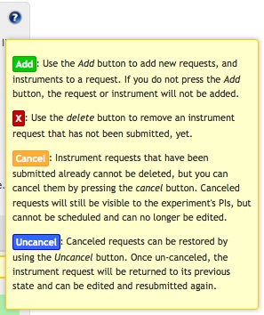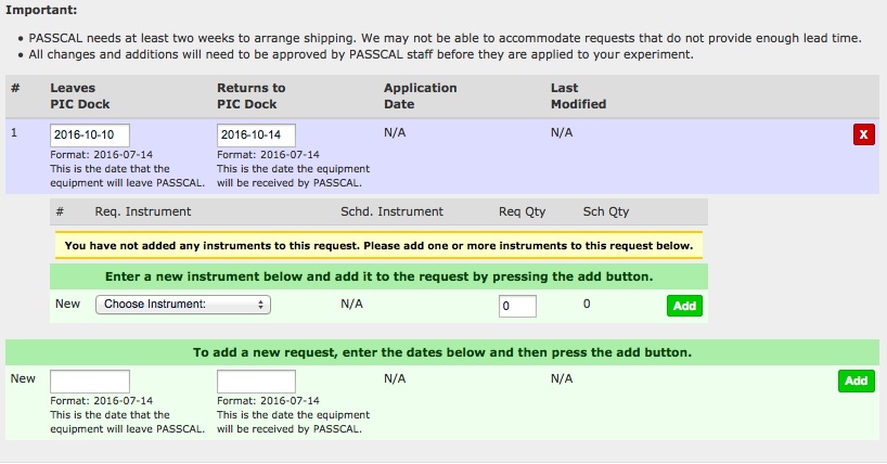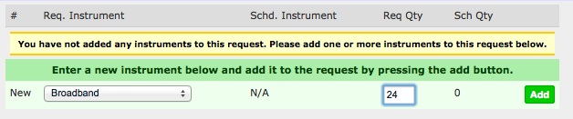 Once the request has been added, it will appear with a violet background, along with a new "X" button which allows you to delete the request. Beneath the newly-created request, you will now see a new row for Instruments. You may add multiple instruments to each Request, and you may ask for additional Requests (with different start and stop dates).