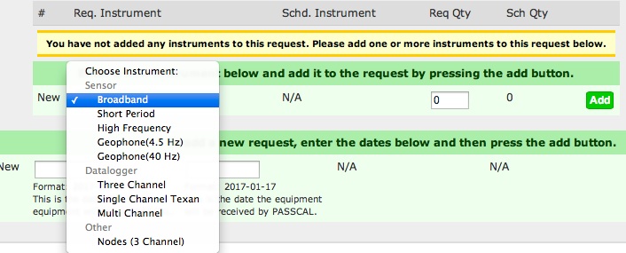 To add Instruments, click the Add button after selecting the instrument type. You may add a Datalogger (DAS) or a sensor. Many requests typically include matched numbers of Sensors and Dataloggers, which appear as two separate Instruments for the request.