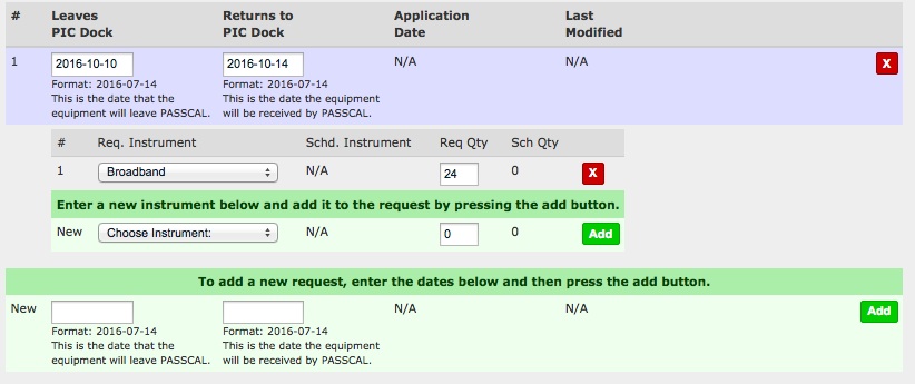 Continue in this manner until you have completed the requests and instruments. Here, the PI is asking for 24 broadband sensors and three-channel Dataloggers for the period 2016-10-10 through 2016-10-14, and for 12 Short Period sensors for the period 2017-10-16 through 2017-10-20.