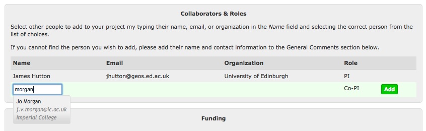 Once the auto-complete for the collaborator has been selected, the PI's email and organization will appear as shown. Then, click the Add button to add this collaborator.