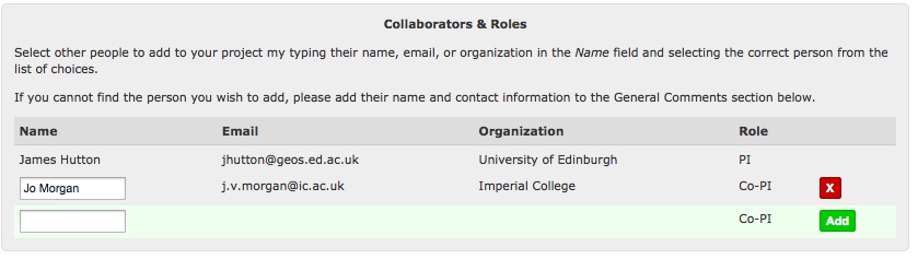 After the collaborator has been added, the form will appear as shown. You may delete the PI, or change the collaborator by typing a different name into the Name field.