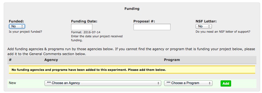 The next section covers Funding and Sponsors. If your project has been funded, be sure to select "Yes" from the funded dropdown; EPIC cannot schedule your project unless the experiment is Funded. If you are still waiting for funding approval, select "No" from the funded dropdown; if your funding is approved later, you can update the request at that time.