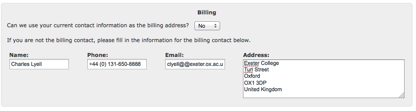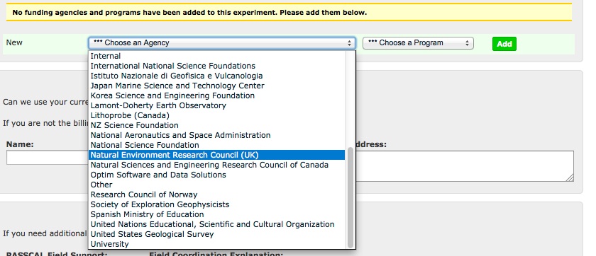 While EarthScope/EPIC does not charge PIs for the use of instruments, PIs must pay for shipping and support costs. If the bills for these expenses should be sent to you, the main (submitting) PI, select "Yes" from the dropdown labeled "Can we use your current contact information as the billing address?" Otherwise, select "No" for this dropdown, and enter the billee's name, phone, email and address, as shown.