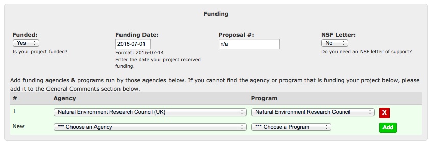 Fill in the Funding Date and Proposal fields if possible. If you need an NSF Support Letter, be sure to select "Yes" from the NSF Letter dropdown. This will start the process in which EarthScope/EPIC develops the Support Letter for your project. We ask that PIs request letters at least two weeks before they plan to submit their proposal, to allow adequate time for EarthScope/EPIC to prepare letters.