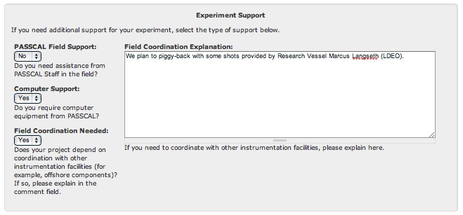 The next section concerns Experiment Support. If you need EPIC personnel to support your field effort, select "Yes" from the "EPIC Field Support" dropdown. Similarly, if you need EPIC laptops in the field, select "Yes" from the "Computer Support" dropdown. If you are coordinating with other projects or experiments, e.g. piggybacking on active sources or etc., select "Yes" from the "Field Coordination" dropdown, and then describe this coordination in the "Field Coordination Explanation" field, as shown.