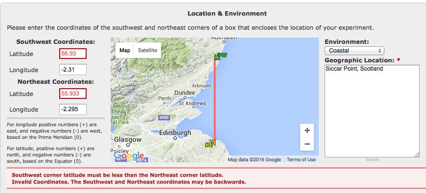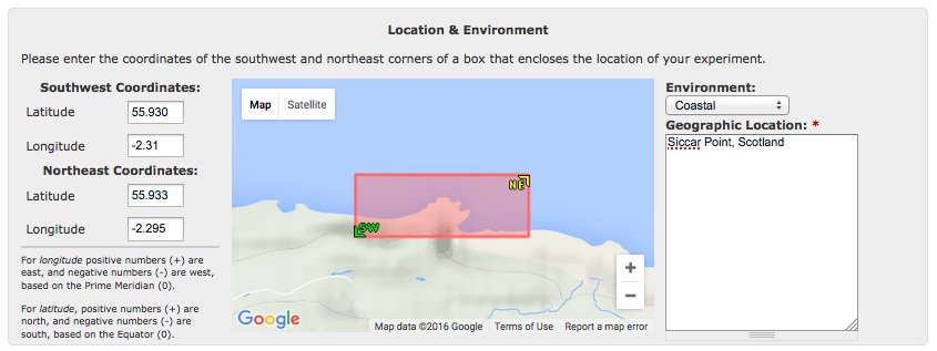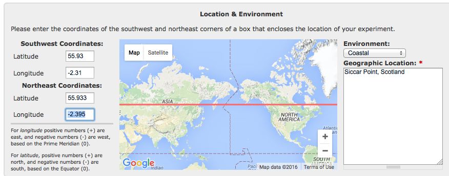 The Location and Environment section allows you to indicate the location of the project with Google Maps. In addition to a dropdown for the type of Environment, and a brief verbal description of the Location, you will be asked to enter latitudes and longitudes for the southwest and northeast corners of your project area.