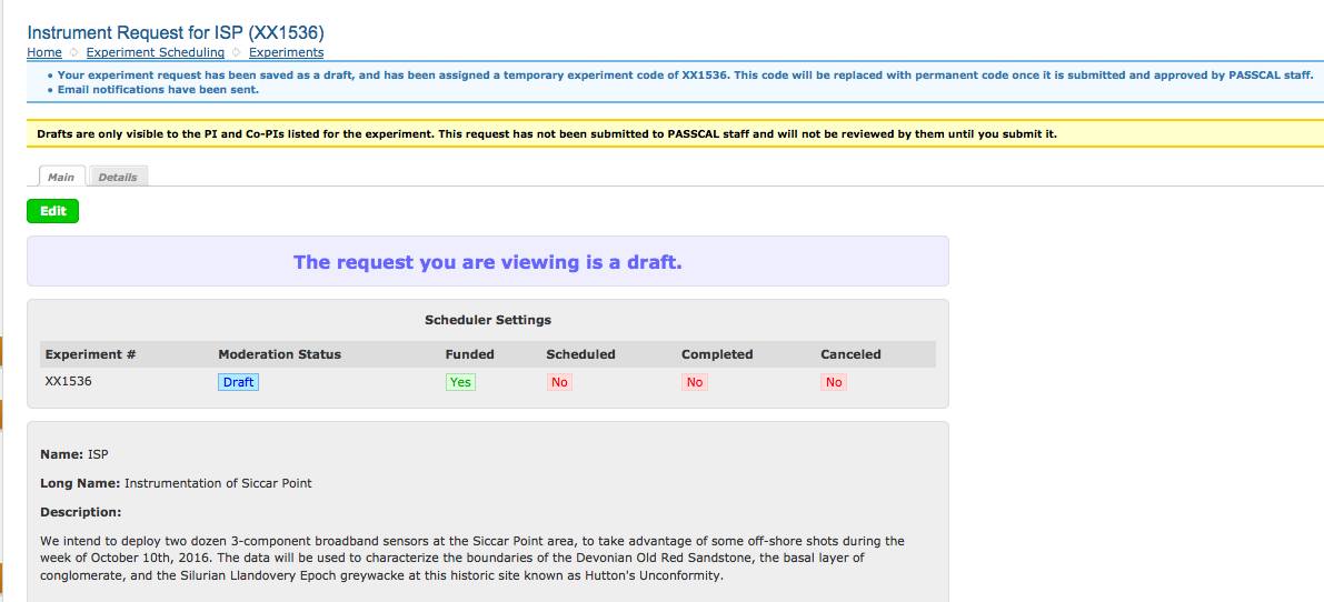 If you save the request as a Draft, its status will be indicated on the new page for the Project. Initially, projects are assigned numbers like XX1538. Later, this number will change once EPIC has approved and/or scheduled your request. The "Edit" button at the top and bottom of the experiment display page allows you to edit the request again, whereupon it can be saved as a draft again, or formally submitted to EPIC.