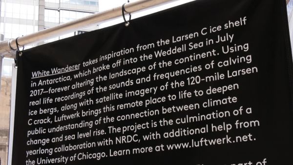 The "White Wanderer" exhibit was inspired by recent events at the Larsen C ice shelf in Antarctica, which plunged into the Weddell Sea in July 2017, changing the very landscape of the continent. The exhibit conveyed the scale of the calving event by comparing it to the Chicago skyline. |