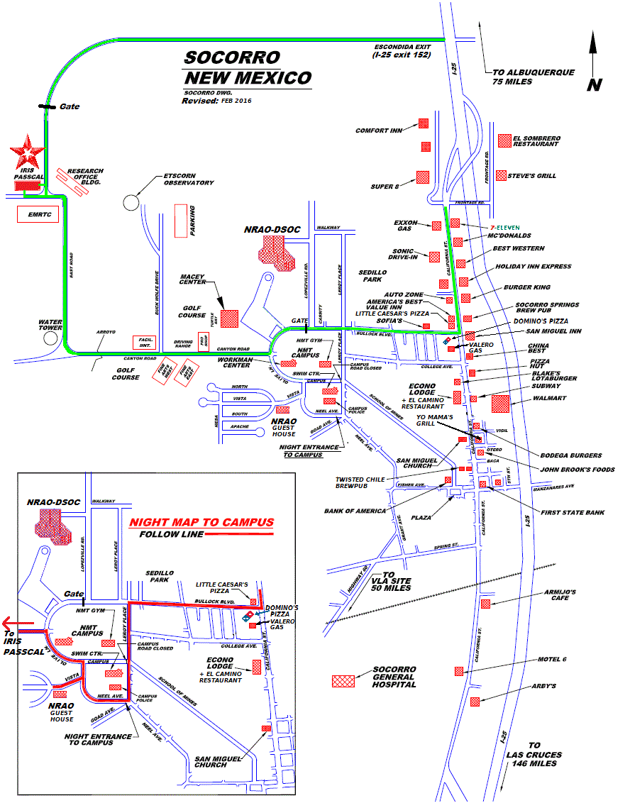 If exiting I-25 at Escondida (exit 152), the East Road gate is open from 6am to 7pm, weekdays only. When this gate is closed, take exit 150 into Socorro. Between 6 AM and 10PM all week, you may get to EPIC via the North entrance (Bullock / Olive Lane). If visiting after hours, take the South entrance (Neel Ave., see "Night Map to Campus" inset).