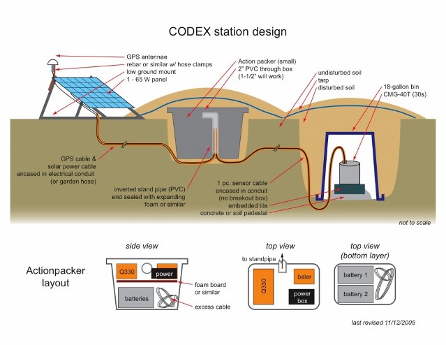 STATION DESIGN: Professor Mike West, prior to his EPIC CODEX experiment on the Colima Volcano in Mexico, drew a station schematic, provided below. Details differ by experiment, but this illustration can be helpful, if you've never constructed a station before.